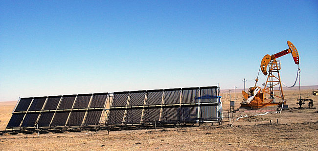 工藝流程:將太陽能集熱來的熱工質(zhì),通過加壓泵加入空心桿內(nèi)管中,熱工質(zhì)沿內(nèi)管向下循環(huán),到底部,再到管外(桿內(nèi))往上方流動將熱量通過桿壁傳給原油,周而復(fù)始;原油溫度升高,被加熱后降粘的原油,由抽油桿提到地上,再由輸油管道輸走。從而達(dá)到較理想的降粘目的。